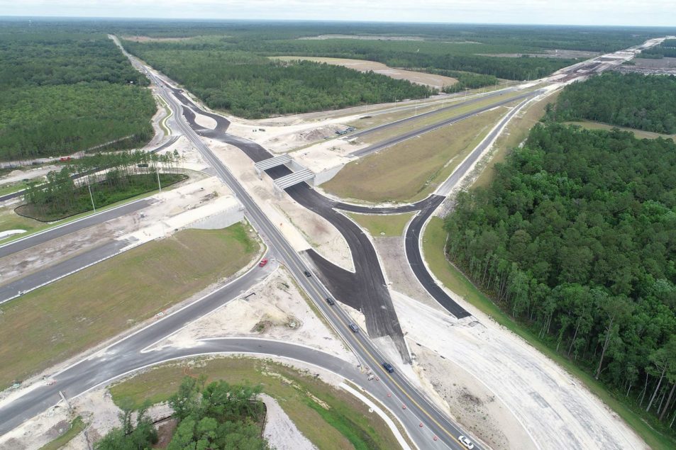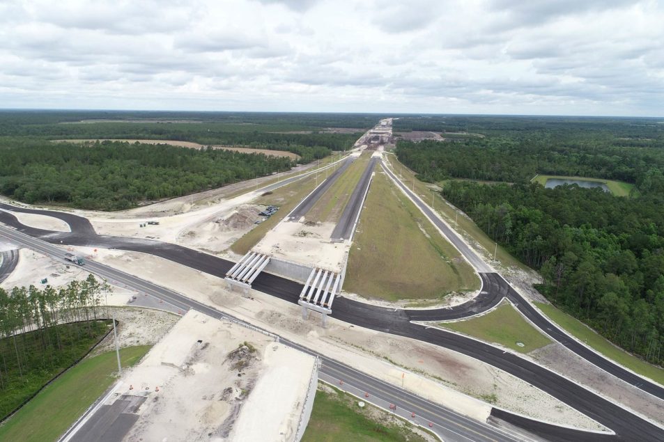 The Florida Department of Transportation (FDOT) is building the First Coast Expressway (FCE), a limited-access toll road connecting I-10 to I-95 to reduce congestion on nearby roadways and provide a storm-related evacuation route. FDOT hired Superior Construction to build a segment of the FCE encompassing nearly 10 miles of roadway with automated toll gantries, 15 bridges, and a stormwater management system. The project includes the construction of a progressive and unique diverging diamond interchange (DDI), which reduces crashes and improves safety on the roadway by eliminating common accident-producing conflict points while reducing queuing time and length.