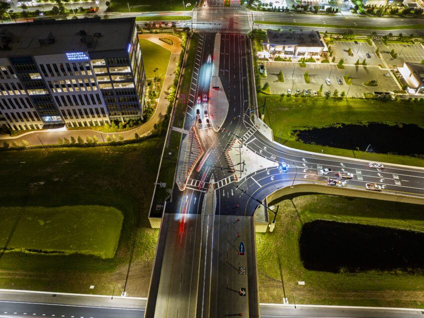 Superior transformed the Daryl Carter Parkway overpass at Interstate 4 in Orlando into a diverging diamond interchange designed to eliminate left-turn conflicts and cut crash risk by half. The new configuration briefly shifts traffic to the left side of Daryl Carter Parkway at controlled signals, reducing traffic signal phases from four to two and significantly decreasing wait times. The new interchange provides an alternative route to heavily trafficked I-4 interchanges in one of Florida’s fastest-growing regions, where more than 278,000 vehicles travel daily.