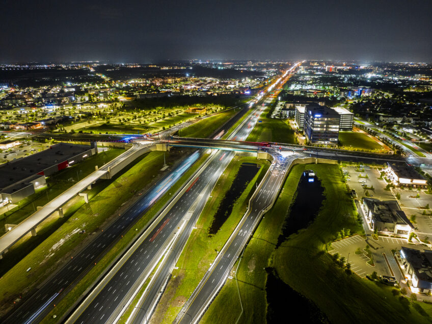 The interchange opened to traffic in July 2025. The diverging diamond configuration eliminates left-turn conflicts, cutting crash risk by 50 percent compared to conventional interchanges. The simplified two-phase signal system reduces wait times throughout the interchange, improving traffic flow in one of Central Florida’s most congested corridors.