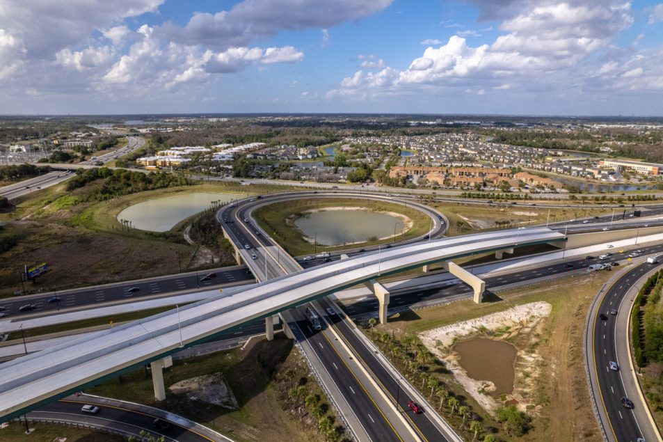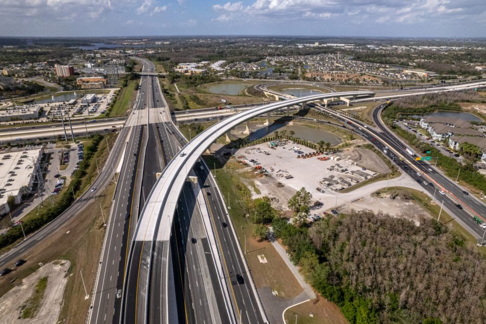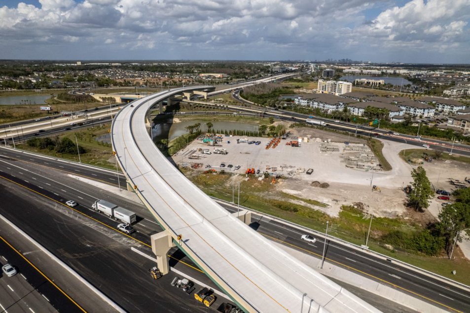 Superior Construction built new express lanes for a portion of Florida Turnpike’s mainline including a direct-connect flyover ramp, approximately 2,000-feet long. In addition to the flyover ramp, miscellaneous roadway improvements, milling, and resurfacing on the mainline were completed between the Beachline Expressway (SR 528) and I-4. The project goal was to improve safety and traffic operations throughout the interchange.