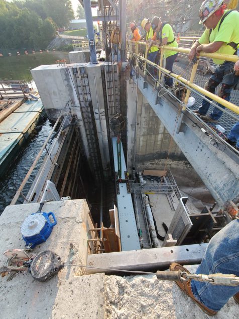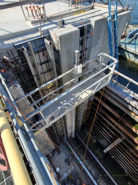 The scope of work included installing the following owner-furnished equipment: two vertical lift wheel gates (30’ W x 22.3’ H) and embedded parts; one set of stoplogs (3 pieces) (30’ W x 28.8’ H) and two sets of embedded parts with one lifting beam and storage device; two sets of flood gate motorized actuator hoists with screw-type bevel gear drives; and one 20-ton monorail stoplog hoist.