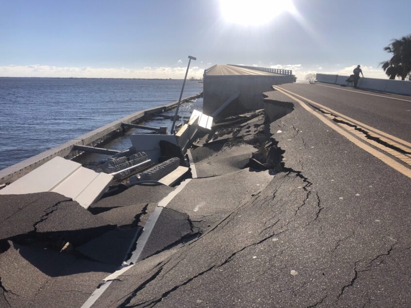 As access was restored, the Joint Venture immediately began planning permanent reconstruction. The phased design-build approach allowed design and construction to advance in parallel, enabling the installation of new bridge approaches, steel sheet pile walls, armor stone protection and improved drainage and lighting systems. Even with a permit delay, the team met its Christmas 2023 substantial roadway deadline while maintaining two lanes of traffic. The durability of the design was validated when three hurricanes struck Florida in 2024 — completed sections remained intact while unfinished areas experienced washouts.