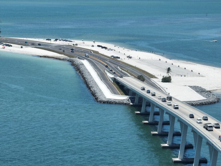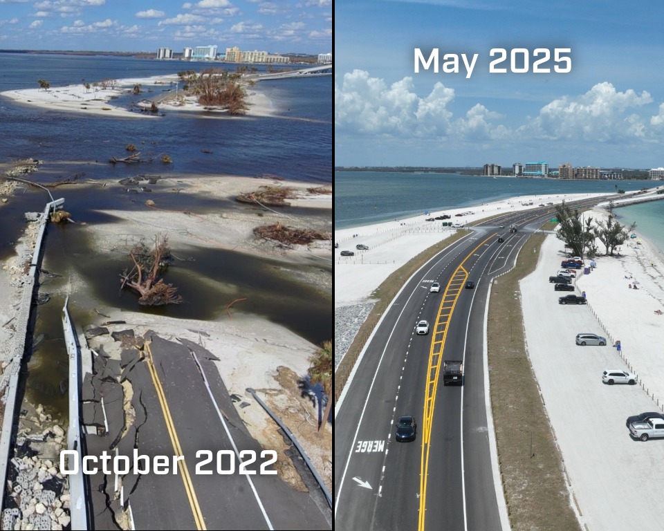 The team substantially completed the project in May 2025 — nearly two years ahead of schedule and under budget. Key improvements included elevated roadway segments, five seawalls with steel sheet pile walls, comprehensive scour prevention systems and extensive shoreline protection. The restored causeway reestablished a critical lifeline for Sanibel Island, and the community response reflected deep gratitude for the speed, coordination and resilience of the Joint Venture’s work.
