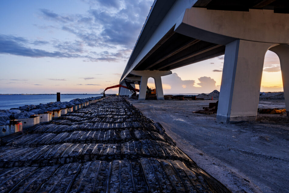 Within a day of Hurricane Ian’s landfall, Superior Construction and The de Moya Group formed a joint venture and were selected by FDOT for the state’s first phased design-build contract — a delivery model that moved directly from emergency repairs into long-term reconstruction. The team restored temporary access in just 15 days, reopening the causeway to residents on October 19, 2022, despite significant logistical hurdles. Crews operated around the clock, using creative solutions such as onsite meal preparation, boat transportation and temporary mobile housing to keep more than 100 workers supported and safe.