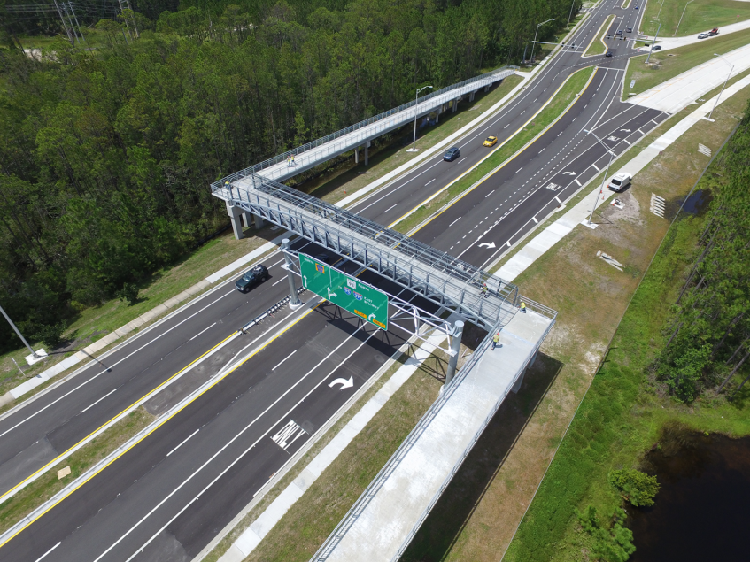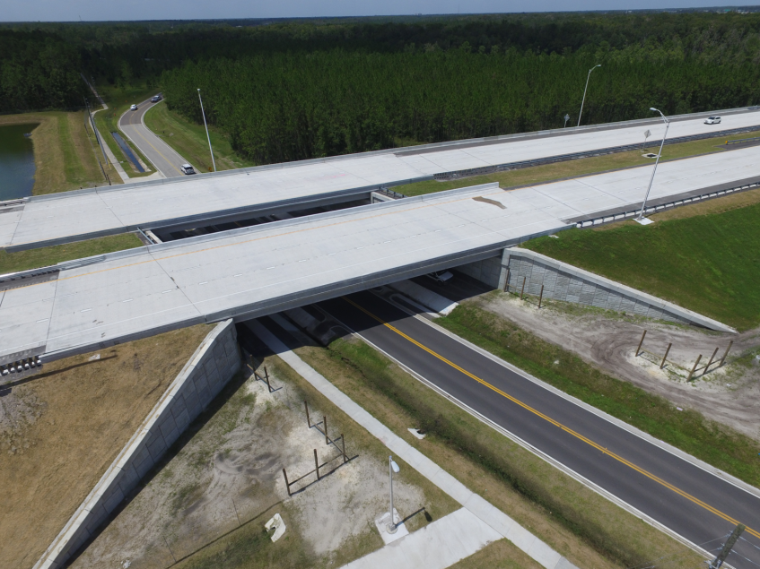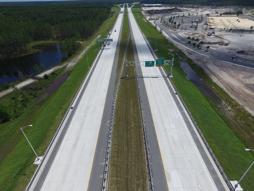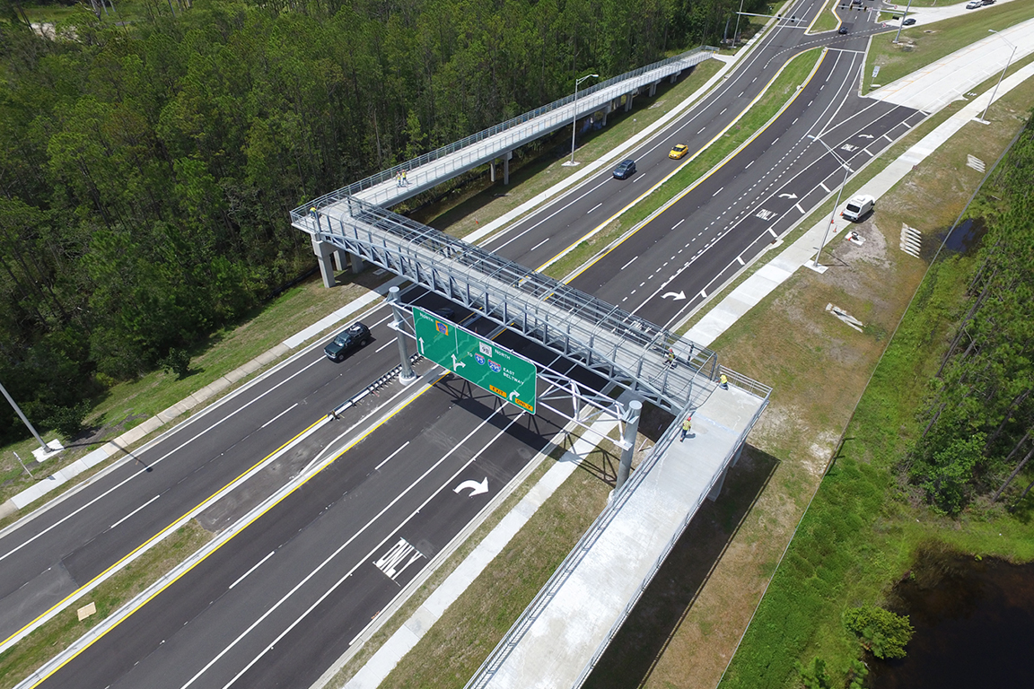 This contract provided the final segment of SR 9B, extending it southward to CR 2209. Project features include four pairs of new overpass bridges, one prefabricated pedestrian bridge, full intelligent traffic system (ITS), and lighting. This project completes the final 2.5 miles of the limited access highway and features nine bridge structures. The signature structures are the twin 833-ft long bridges over Durbin Creek and the surrounding wetlands, constructed from temporary work trestles to minimize environmental impacts.
