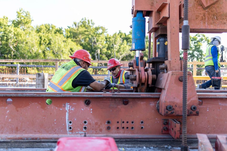 Because of the limitations of space to set up a pre-cast yard, we used cast-in-place construction. Segmental construction requires post-tensioning (PT) systems, which need to be protected. Instead of grout, we used a flexible filler of microcrystalline wax to provide strand protection, enabling tendon strand replacement over time. For the conventional bridges, we used an overhang system that comes in 20-foot sections, which enabled faster deck pours. We also used a Tybot system, which uses lasers to make tie connections, further speeding up production.
